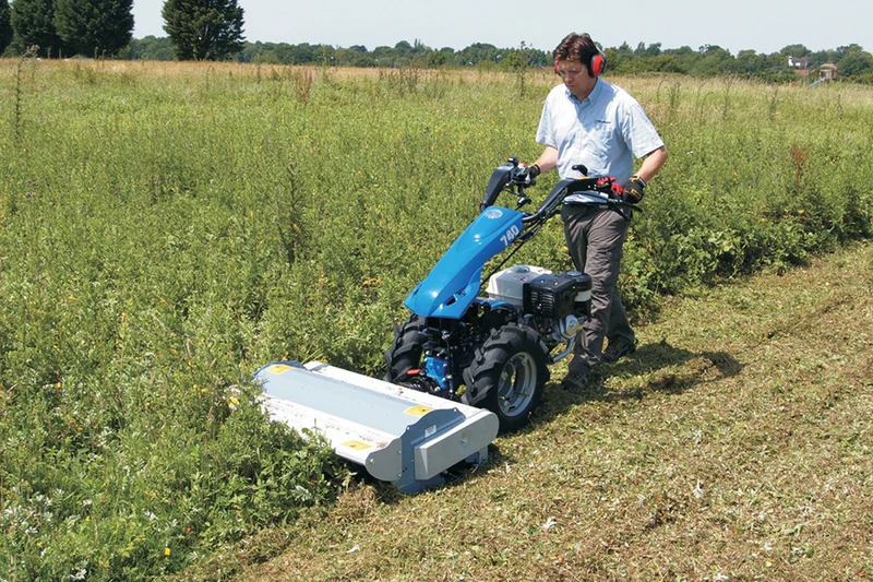 The hydrostatic drive of BCS 780HY offers the user the ability to control their ground speed precisley without the need to engage the clutch. This has several benefits for the operator, particularly when digging or cutting grass. Cultivating often requires a slow ground speed to enable digging knives time to cut into the ground. The variable speed allows you to choose the best speed for the ground conditions in this case. When grass cutting, you are often travelling at different speeds depending on the density of vegetation and often you will be going forward and reverse in tight spaces. The hydrostatic control in this application allows you to change speed and direction without engaging the clutch which means that the cutting head never slows down. For flail mowers and rough-cut mowers, this is a real benefit.